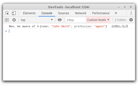 const myObject = { name: 'John Smith', profession: 'agent'};console.log('Neo, be aware of %o', myObject);