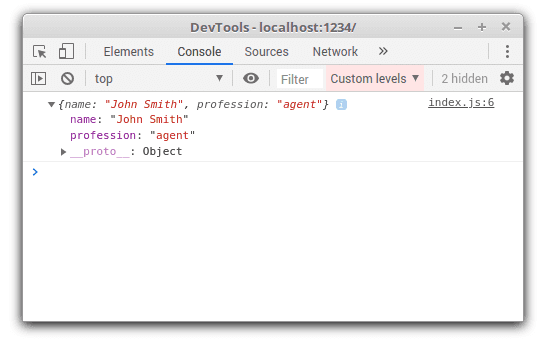 const myObject = { name: 'John Smith', profession: 'agent'};console.log(myObject);