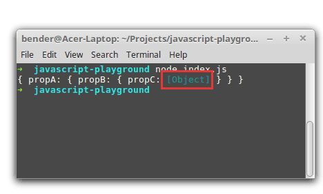 const myObject = { propA: { propB: { propC: { propD: 'hello' } } }};console.dir(myObject, { depth: null });