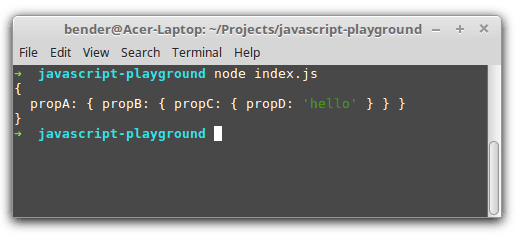 const myObject = { propA: { propB: { propC: { propD: 'hello' } } }};console.log(myObject);