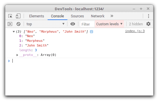 const characters = ['Neo', 'Morpheus', 'John Smith'];console.log(characters);