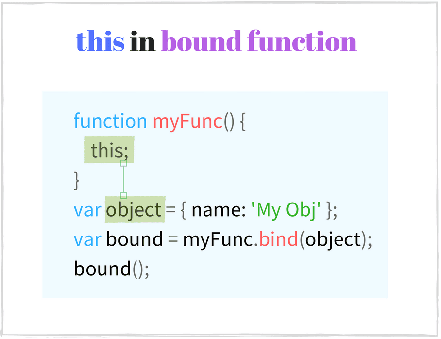 const numbers = { array: [3, 5, 10], getNumbers() { return this.array; }};// Create a bound functionconst boundGetNumbers = numbers.getNumbers.bind(numbers);boundGetNumbers(); // => [3, 5, 10]// Extract method from objectconst simpleGetNumbers = numbers.getNumbers;simpleGetNumbers(); // => undefined or throws an error in strict mode
