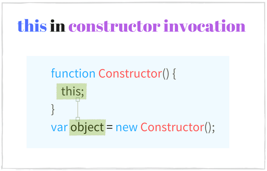 function Foo () { // this is fooInstance this.property = 'Default Value';}// Constructor invocationconst fooInstance = new Foo();fooInstance.property; // => 'Default Value'