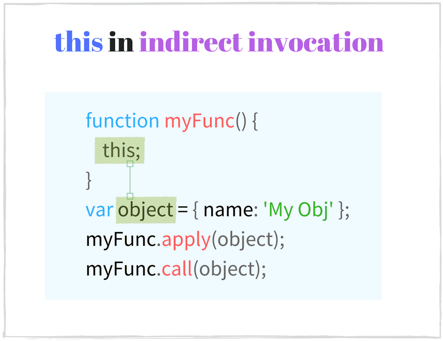 const rabbit = { name: 'White Rabbit' };function concatName(string) { console.log(this === rabbit); // => true return string + this.name;}// Indirect invocationsconcatName.call(rabbit, 'Hello '); // => 'Hello White Rabbit'concatName.apply(rabbit, ['Bye ']); // => 'Bye White Rabbit'