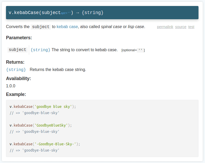 You can easily understand how to use kebabCase() function: what it does, what parameters it accepts, and the returned value. A few examples are presented as well. You can even find links to the source code and the unit test.
