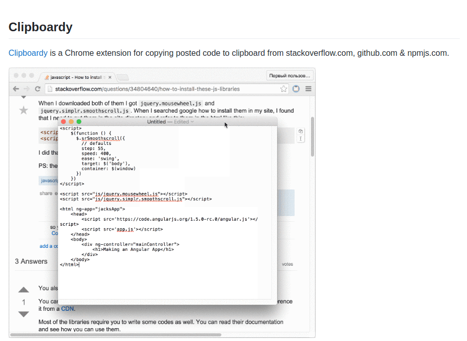 For example, I implemented a small open source Chrome extension Cliboardy. It copies posted code to clipboard from stackoverflow.com, github.com & npmjs.com.