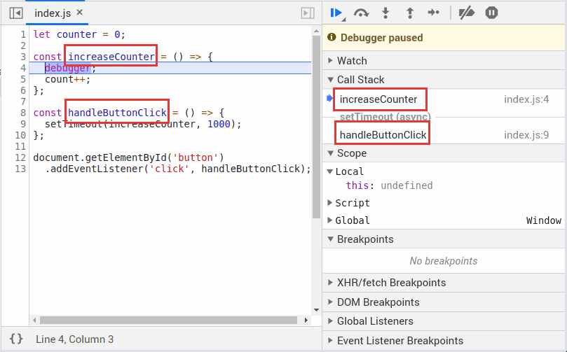 Because the arrow functions have names, the call stack gives more information about the code being executed: