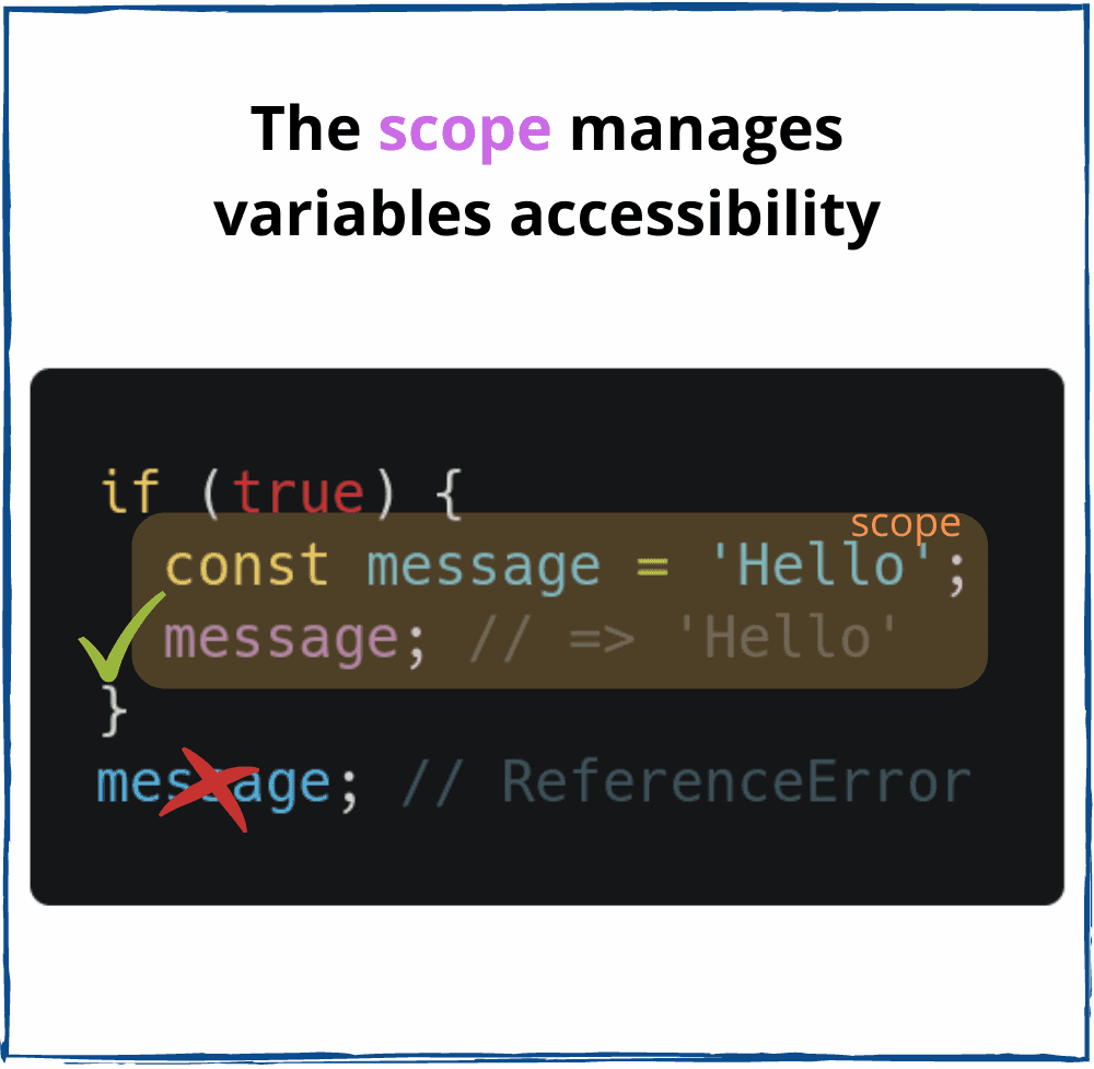 But the second console.log(message) throws a reference error because message variable is accessed outside of its scope: the variable doesn't exist here.