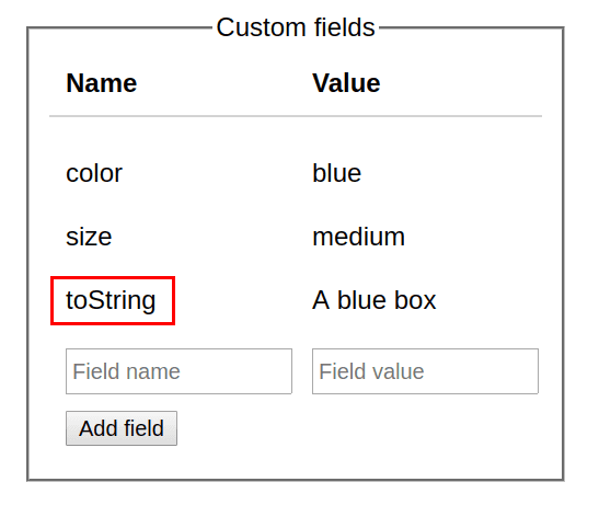 const userCustomFields = { 'color': 'blue', 'size': 'medium', 'toString': 'A blue box'};