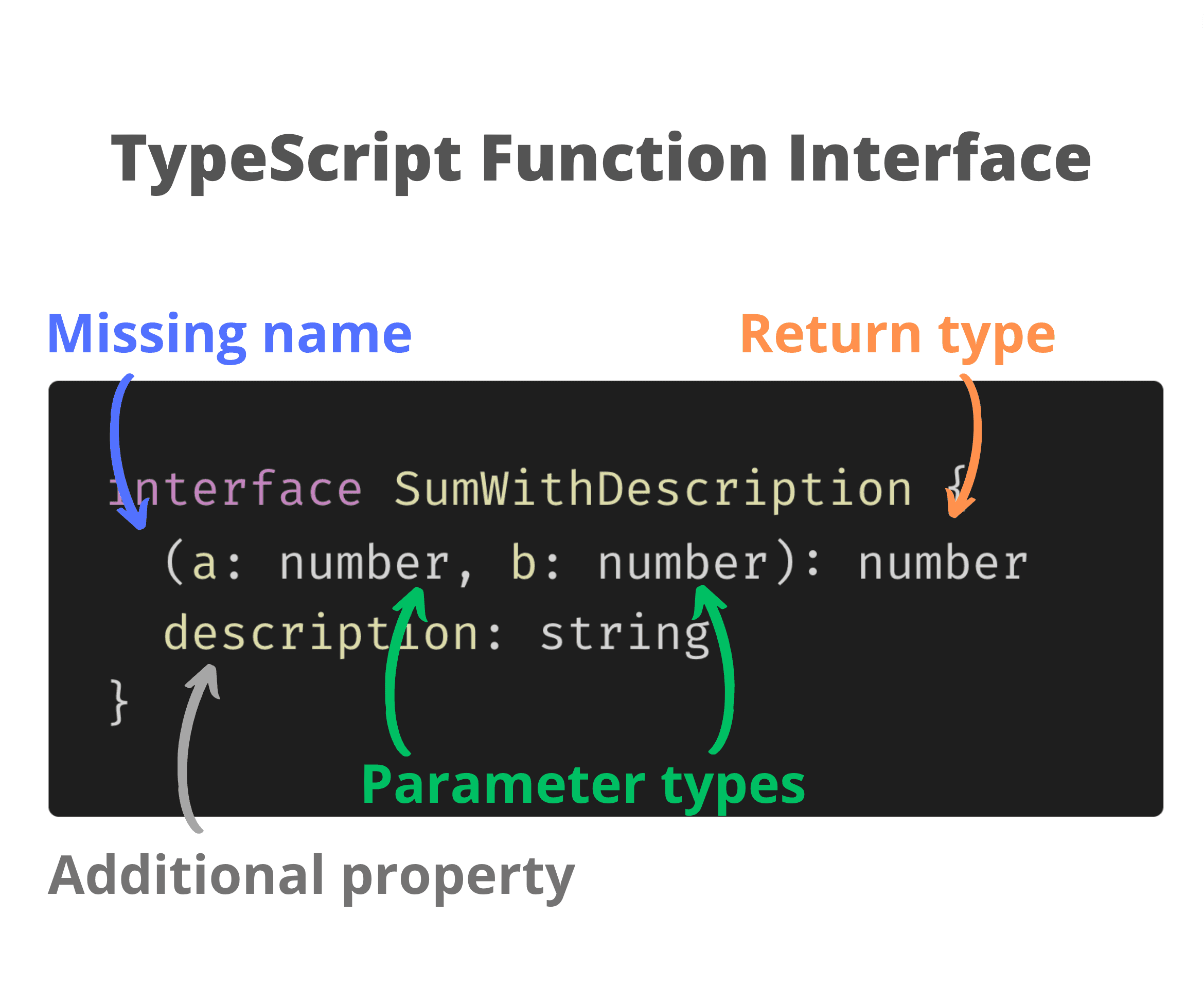 type Sum = (a: number, b: number) => numberconst regularFunc: Sum = function(a, b) { return a + b } // OKconst arrowFunc: Sum = (a, b) => a + b // OK